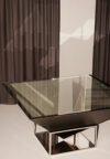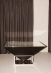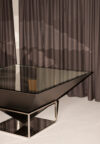 Black lacquered wood, Polished stainless steel, Mirror, Clear glass