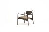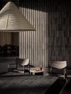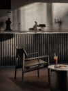 The A-LC01 armchair, designed by Keiji Ashizawa for Karimoku Case, is a masterpiece that celebrates Japanese craftsmanship through the use of fine materials and refined details. The backrest, carved from a single block of wood, offers enveloping support that harmonizes with the softness of the seat padding.