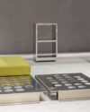 NM3 is a design company based in Milan. NM3's main production is metal. Production is based on the capabilities provided by medium-light metalworking tools and processes, including 2D CNC cutting, press brakes, threading and inserts. Starting from a uniform sheet metal, the objects are laser cut and dry assembled.