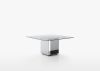 Il tavolo Glimm di Acerbis, disegnato da Gabriele e Oscar Buratti nel 2001, si distingue per il suo design minimalista ed elegante. Presenta un piano in vetro trasparente caratterizzato da un riquadro centrale sabbiato sul lato inferiore. La base rettangolare cava è realizzata con un pannello strutturale innovativo: l'esterno è in acciaio inossidabile lucidato a specchio, mentre l'interno è disponibile in diverse finiture, tra cui cristallo laccato nero, vetro a specchio e vetro a specchio piombo.