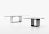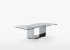 Il tavolo Glimm di Acerbis, disegnato da Gabriele e Oscar Buratti nel 2001, si distingue per il suo design minimalista ed elegante. Presenta un piano in vetro trasparente caratterizzato da un riquadro centrale sabbiato sul lato inferiore. La base rettangolare cava è realizzata con un pannello strutturale innovativo: l'esterno è in acciaio inossidabile lucidato a specchio, mentre l'interno è disponibile in diverse finiture, tra cui cristallo laccato nero, vetro a specchio e vetro a specchio piombo.